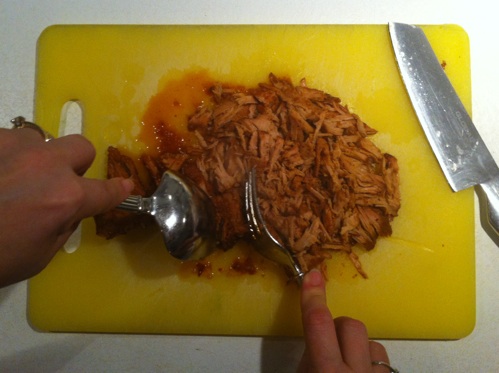 Lyft upp köttet på en skärbräda eller ett fat och dra isär köttet. Lägg tillbaka köttet i såsen. Hit kan du förbereda och bara